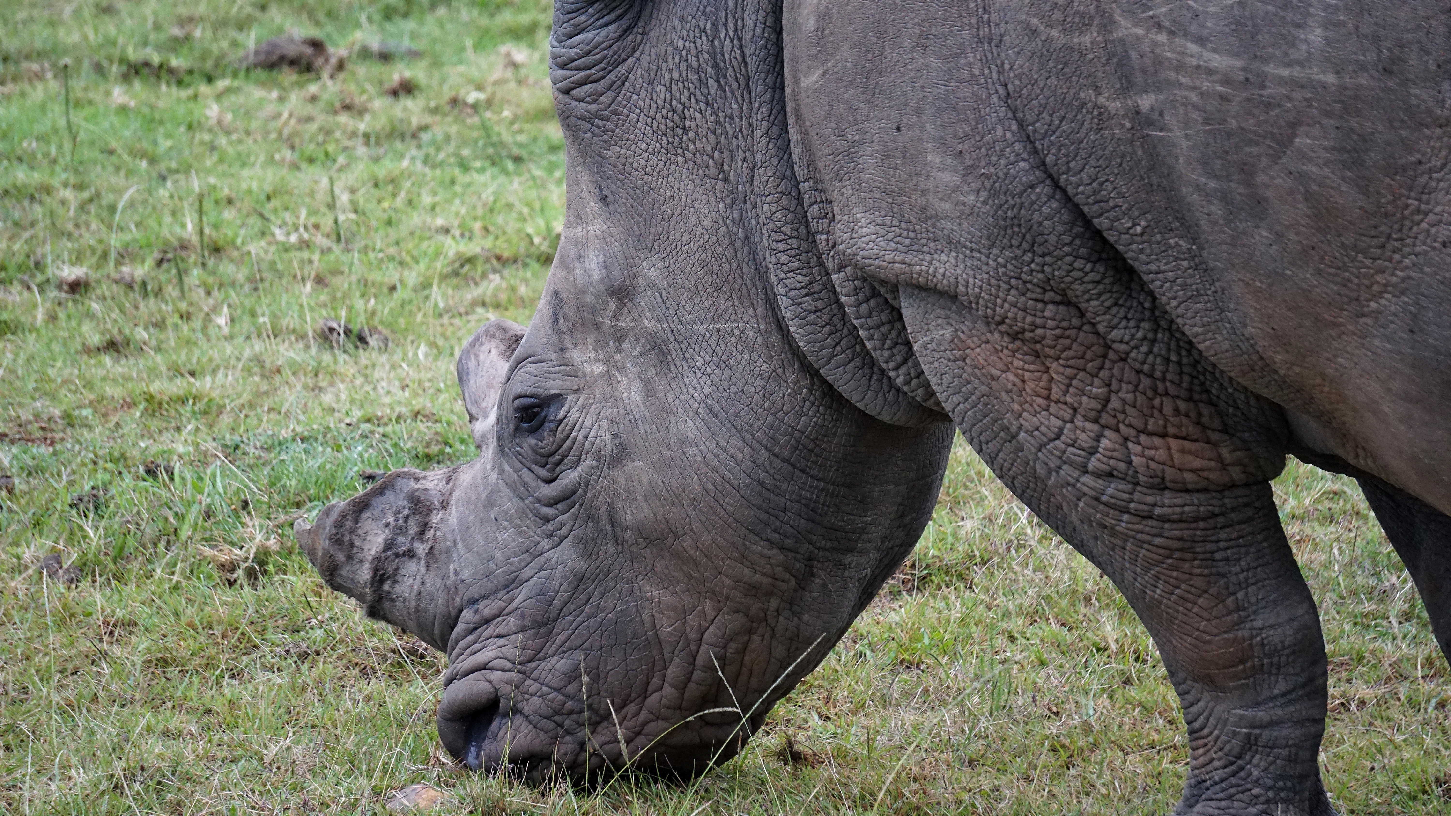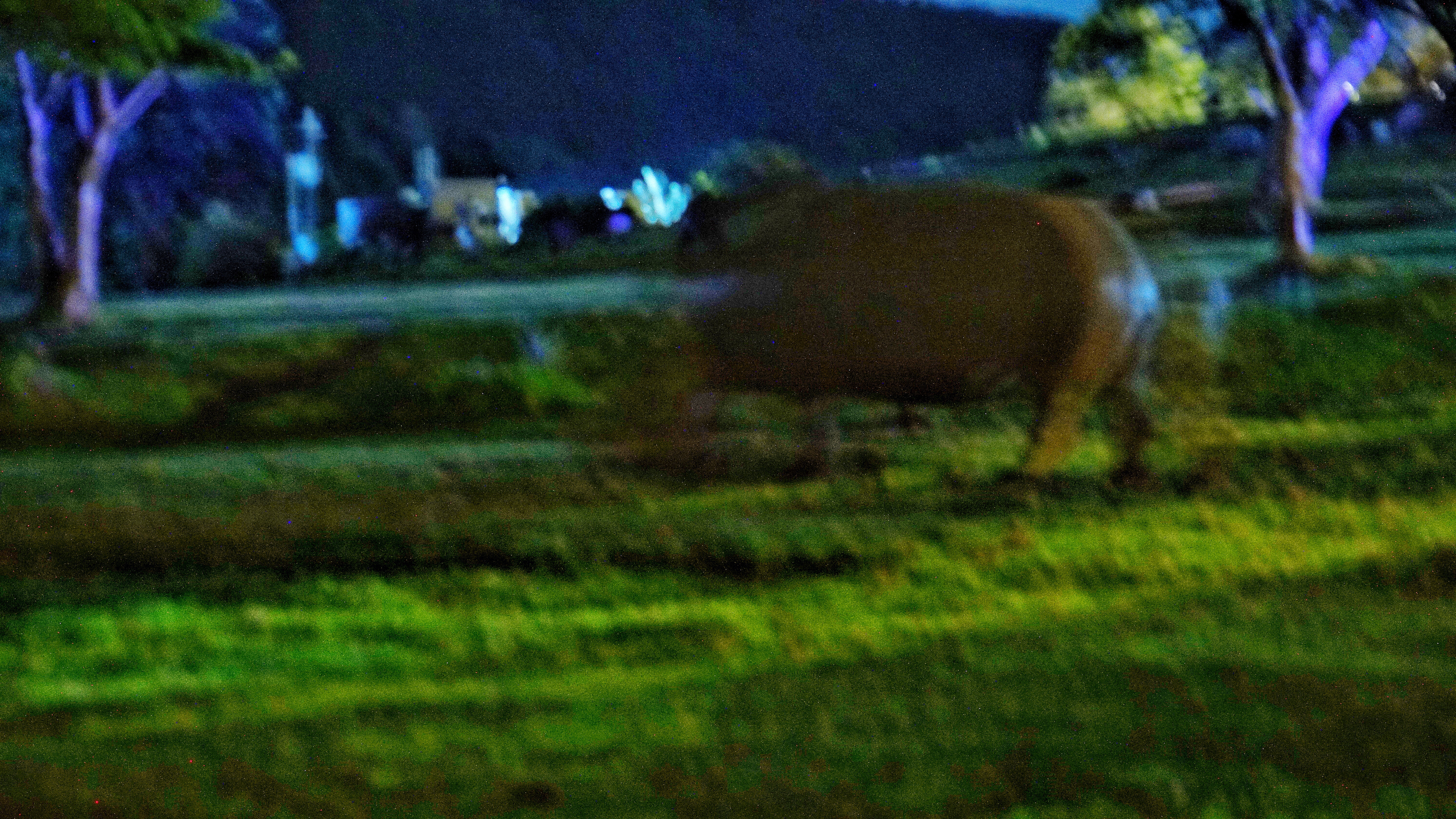 Und richtig genial wurde es dann nachts! Nichtsahnend wollten wir uns auf die Terrasse setzen und hörten dann plötzlich Fressgeräusche. Es war extrem dunkel, so dass wir erst nicht unseren Augen trauen konnten. Ungefähr 5 Meter entfernt von unserer Terrasse, wie gesagt OHNE ZAUN, grasten die Nashörner, die tagsüber noch in der Ferne zu sehen waren. Mein Herz schlug bis zum Hals und keiner von uns bewegte sich noch nicht einmal ein bisschen, ich glaube kurzzeitig hörte mein Herz dann auf zu schlagen und meine Atmung setzte aus. Zumindest fühlte sich das alles für einen Augenblick so an. Weil ich kein Tier erschrecken wollte (weil mir mein Leben lieb ist 😬), machte ich den Blitz meiner Kamera aus und schoss ein paar Fotos. Wie man sehen kann, sieht man nicht viel, leider. Aber das Tier ist zu erkennen, wenn auch nur ohne Kopf. Der Grund ist, dass die beim Grasfressen immer weiterlaufen und ohne Blitz hat die Kamera Probleme mit der Schärfe bei selbst geringster Bewegung. Es waren 3 Nashörner insgesamt. Das war mal ein richtig abenteuerlicher Start!