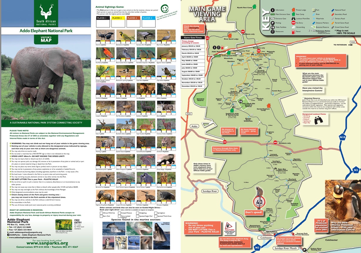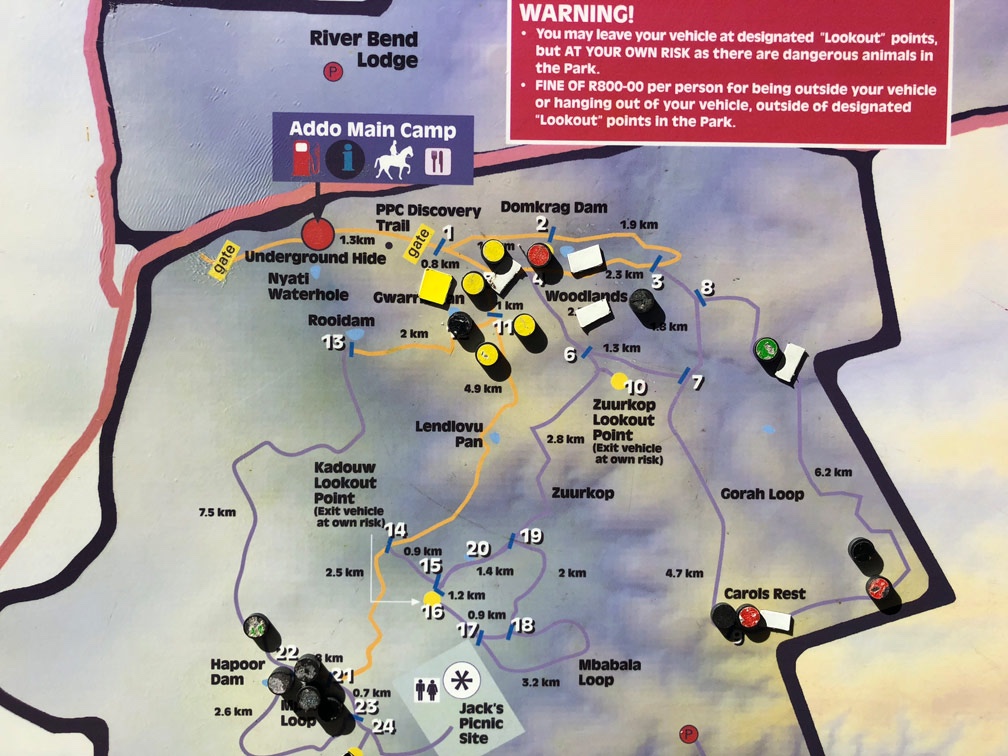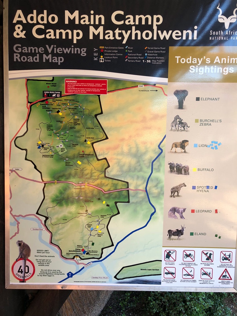 Wir kamen dann doch recht spät in der Elephant Footprint 👣 Lodge an, aber das war okay, denn Hunger hatten wir eh nicht mehr, so konnten wir uns im Zimmer breit machen und schon bald schlafen, damit wir fit für die nächste Safari sind. Diesmal wollten wir das ohne Guide machen, denn im Addo Nationalpark kann man auch selber mit dem Auto durchfahren, man muss einige wenige Regeln beachten und schon kommt man sicher durch. Sie drücken einem vorher noch einen Bilderkatalog in die Hand auf dem alle Tiere des Parks notiert und abgebildet sind. Der dient dann als Challenge fuer die Leute, die Lust auf ein Spielchen haben. Je mehr man sieht umso mehr Punkte gibt es 🙂 Damit steigert sich die Aufmerksamkeit natürlich und man sucht fokussiert.
