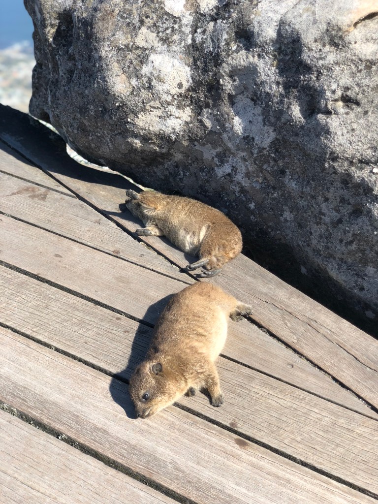 Und richtig süß sind die Felsenratten, die sie dort Dassies nennen. Auf keinen Fall darf man die faulen Dickerchen füttern. Die liegen da rum und bewegen sich kaum, die Augen aber folgen einem dann doch. Kaum hatten wir die pelzigen Tierchen entdeckt, war die Aussicht schon gar nicht mehr wichtig! Aber halt, dachte ich mir dann! So viel gelaufen, so viel geschwitzt und jetzt muss ich das auf jeden Fall genießen! Wir hatten Glück, dass das Wetter fantastisch sonnig war an dem Tag, so dass wir auch einen wunderbaren Blick auf die Bucht hatten. Von da oben konnte man sogar in etwa sehen, wo unsere schöne Bleibe war. Als wir dann sahen, dass da die Gondel nach unten fuhr, entschieden wir uns einen auf einen faulen Dassie zu machen und stiegen da ein.